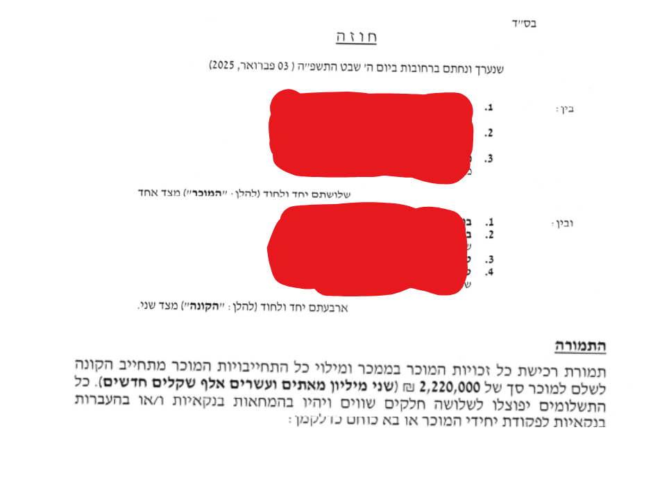 שלב 1: משא ומתן אסטרטגי ניהלנו משא ומתן מתוחכם. במקום להתמקד רק במחיר, הפכנו את היטל ההשבחה למנוף. הורדנו את מחיר הרכישה מ-2,450,000 ש"ח ל-2,220,000 ש"ח, ולקחנו על עצמנו את תשלום ההיטל. מדוע? הערכה המוקדמת שלנו יחד עם שמאי מקרקעין מוסמך, הייתה שההיטל לא יהיה גבוה יותר מ כ-100,000 ש"ח, והמוכר שלא רצה להיות בחוסר ודאות בהקשר הזה הסכים WIN-WIN.
