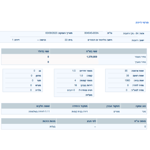 ניתן לראות בתוך האתר של רשות המיסים את כל העסקאות שבוצעו משנת 1989 ולראות כי עסקה זו נרכשה בתאריך ה03/09/2023 ב1,370,000 ש"ח.