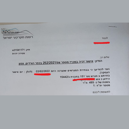 לאחר הזכיה שלכם במכרז ולאחר שלב בחירת המגרשים תקבלו "אישור זכייה במכרז".