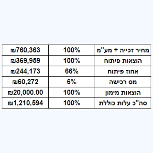 טבלה שלנו ע"מ שתבינו את ההוצאות שהיו בעסקה הזו ספציפית ובעסקאות כאלו בכלל, (שימו לב כי המספרים כמובן הם דינמיים ומשתנים ממכרז למכרז וכי האגרות מחושבות כבר בתוך מחיר הזכייה).